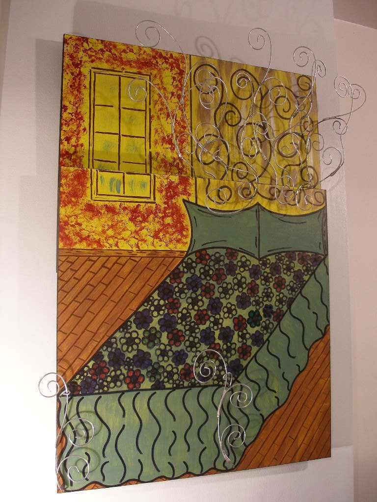 Acrylic and Ink on 1/4" MDF, with Twirled 14G Wire. Also check out the Eye Catching 14G Wire Bed Frame extending from the Bed on the top and the bottom of Bed in the Art Piece. You Can Actually Touch It. It's Cool. Note: This is a 100% original Dimensional Sculpture Painting By: Vaughn.